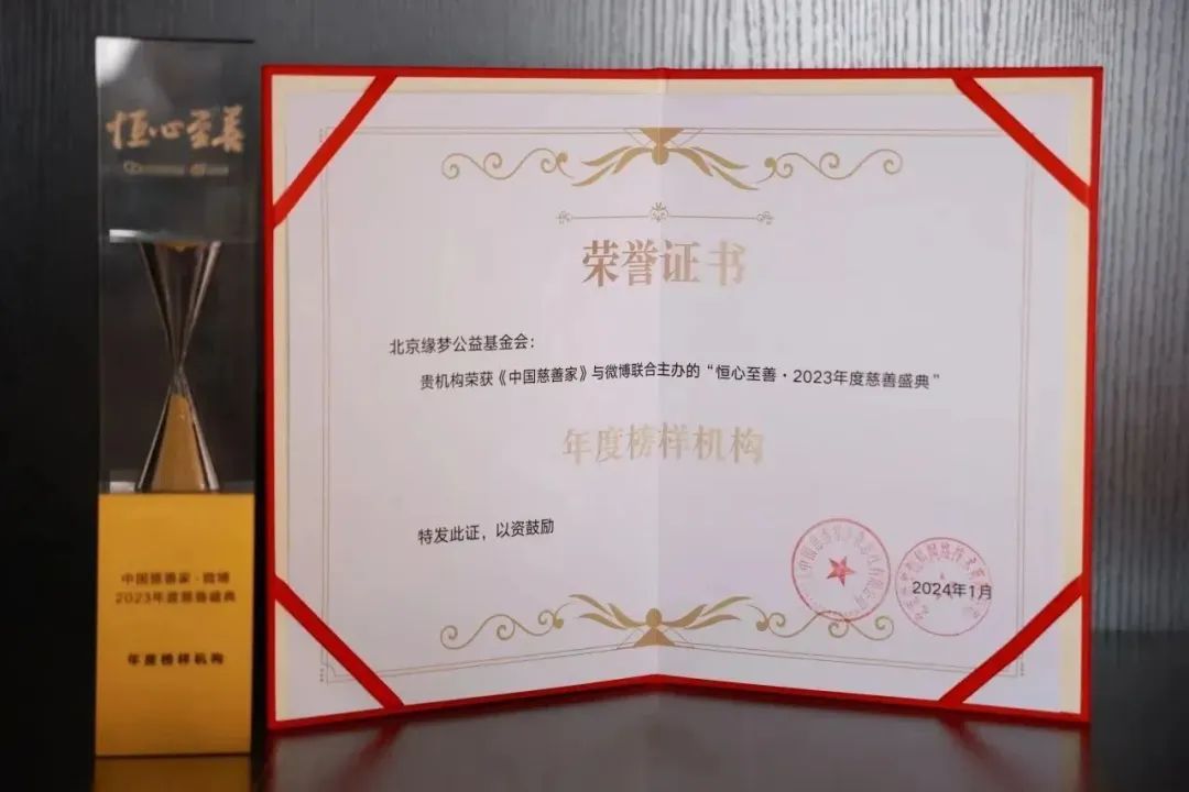 1月8日,由《中国慈善家》和微博联合主办的“恒心至善”2023年度慈善盛典在北京启幕。经过专业遴选和公众通过“中国慈善家活动网站”和微博“2023年度慈善盛典”活动主页投票,北京缘梦公益基金会荣获“慈善盛典年度榜样机构”奖项。