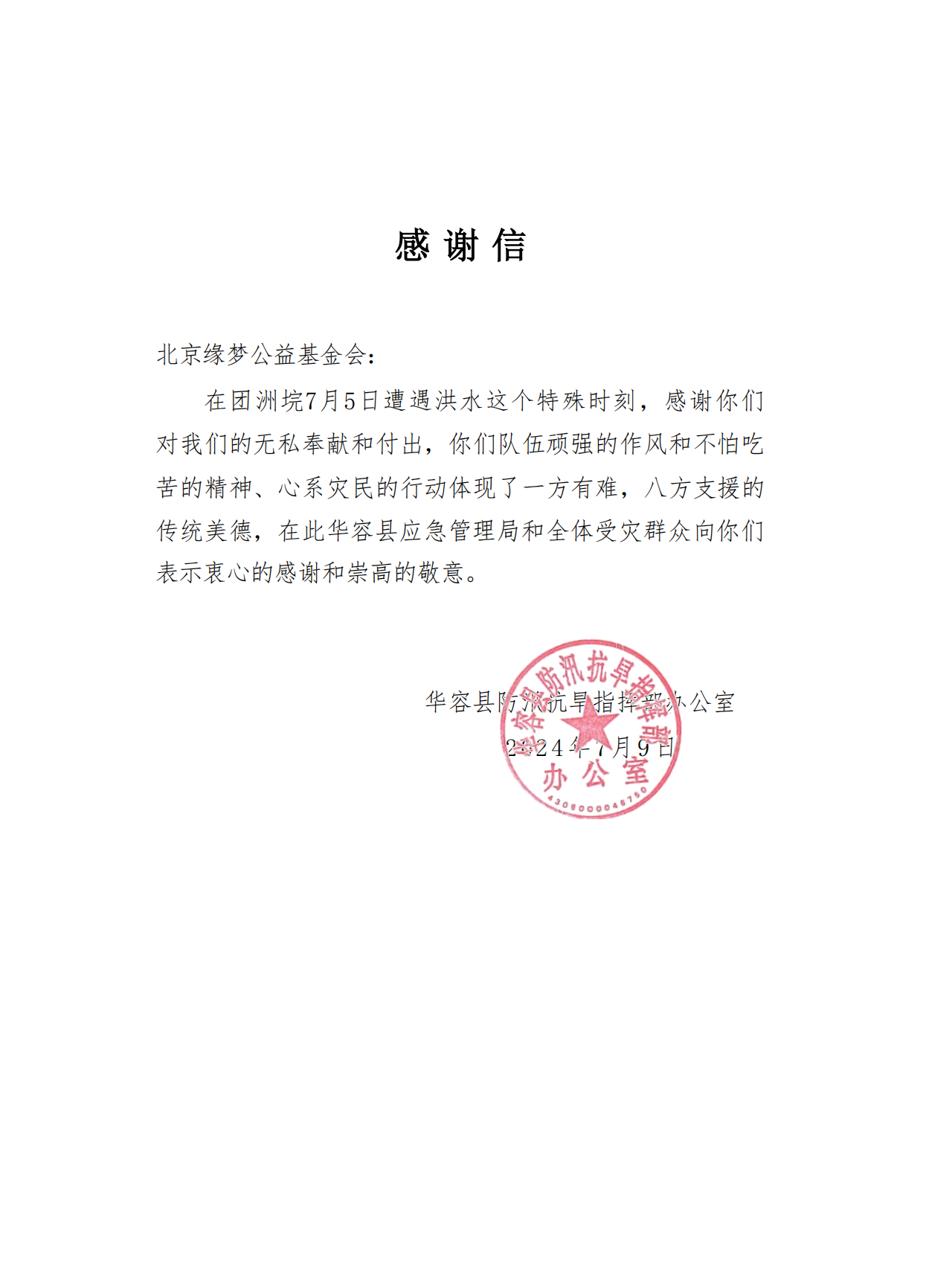 湖南华容县防汛抗旱指挥部办公室向北京缘梦公益基金会发来感谢信。